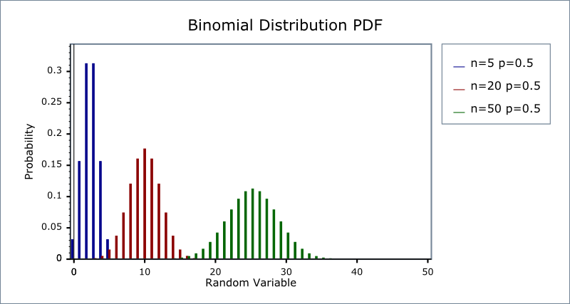 The following two graphs illustrate how the PDF changes depending upon the distributions parameters, first we'll keep the success fraction p fixed at 0.5, and vary the sample size: