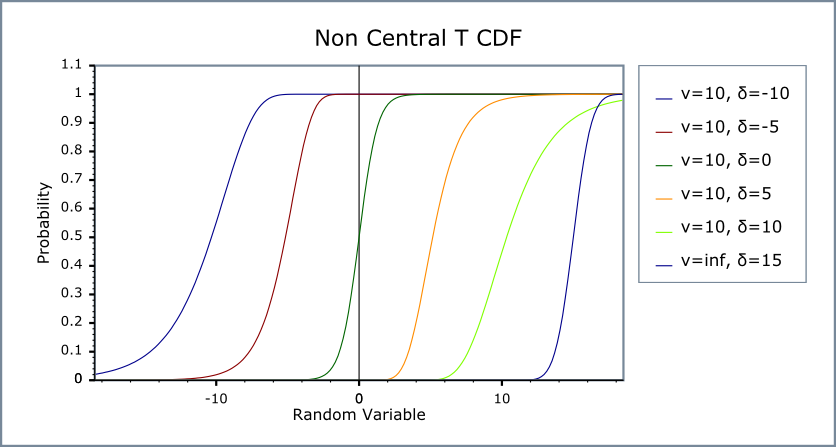 Constructs a non-central t distribution with degrees of freedom parameter v and non-centrality parameter delta.