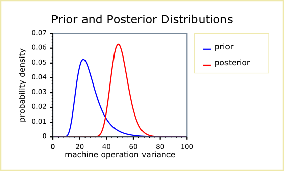 Machine-specific data consist of 100 balls which were accurately measured and show the expected mean of 3000 μm and a sample variance of 55 (calculated for a sample mean defined to be 3000 exactly). From these data, the prior parameterization, and noting that the term Σni=1(xi - μ)2 equals the sample variance multiplied by n - 1, it follows that the posterior distribution of the variance parameter is scaled-inverse-chi-squared distribution with degrees-of-freedom (νposterior) = 120 and scale (sposterior) = 49.54.