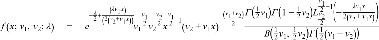 where X is a noncentral χ2 random variable with v1 degrees of freedom and non-centrality parameter λ, and Y is a central χ2 random variable with v2 degrees of freedom.