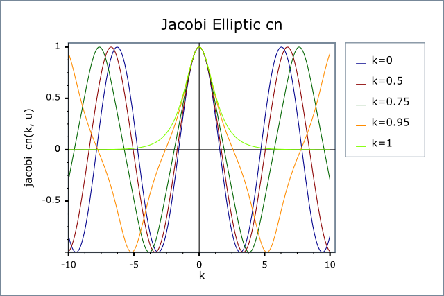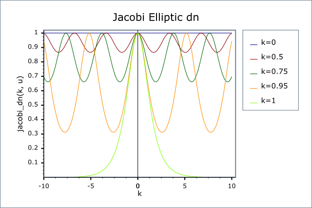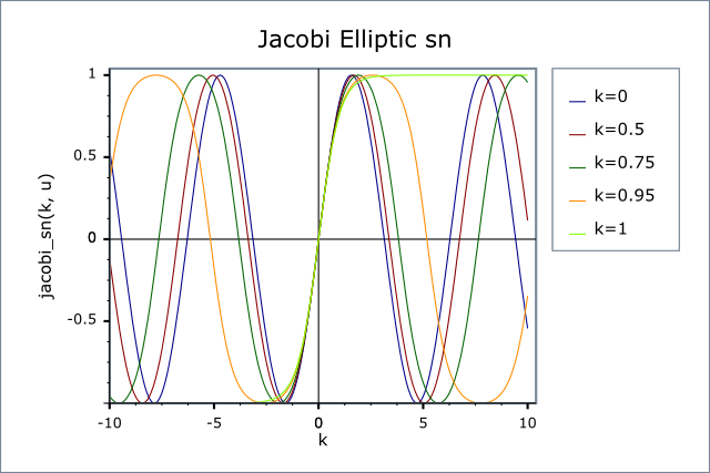 The following graphs illustrate how these functions change as k changes: for small k these are sine waves, while as k tends to 1 they become hyperbolic functions: