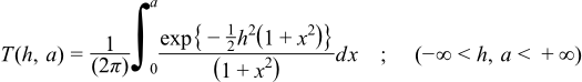 For h and a > 0, T(h,a), gives the volume of an uncorrelated bivariate normal distribution with zero means and unit variances over the area between y = ax and y = 0 and to the right of x = h.