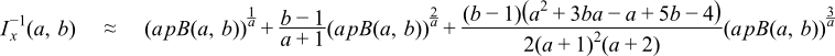 First an initial approximation is computed for a or b: where possible this uses a Cornish-Fisher expansion for the negative binomial distribution to get within around 1 of the result. However, when a or b are very small the Cornish Fisher expansion is not usable, in this case the initial approximation is chosen so that Ix(a, b) is near the middle of the range [0,1].