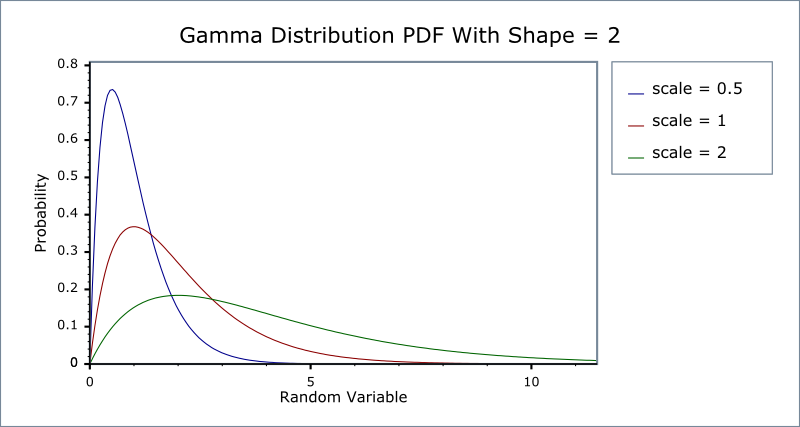 The following two graphs illustrate how the PDF of the gamma distribution varies as the parameters vary: