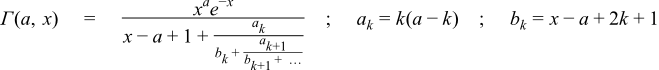 There are two sets of tests: spot tests compare values taken from Mathworld's online evaluator with this implementation to perform a basic "sanity check". Accuracy tests use data generated at very high precision (using NTL's RR class set at 1000-bit precision) using this implementation with a very high precision 60-term Lanczos approximation, and some but not all of the special case handling disabled. This is less than satisfactory: an independent method should really be used, but apparently a complete lack of such methods are available. We can't even use a deliberately naive implementation without special case handling since Legendre's continued fraction (see below) is unstable for small a and z.