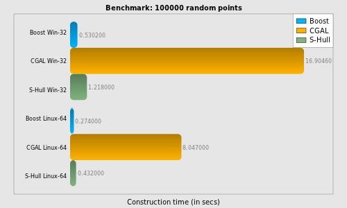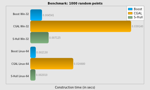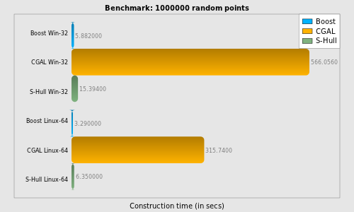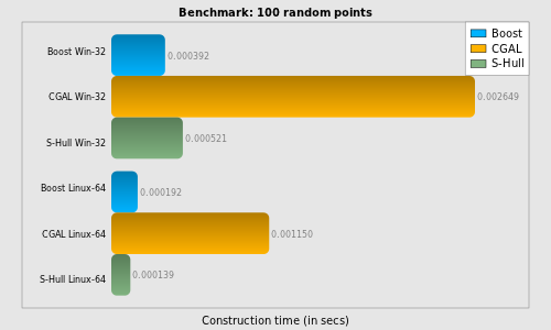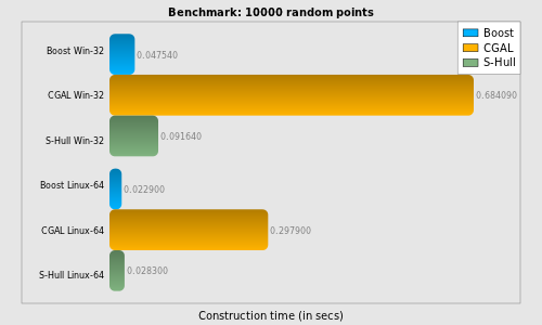 S-Hull (except small input sets of around 100 points on Linux-64).