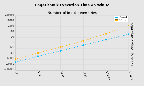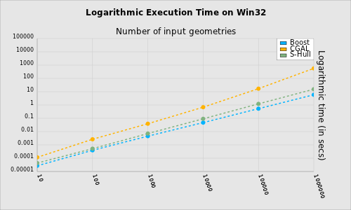 - Logarithmic execution time shows that Boost.Polygon Voronoi and S-Hull