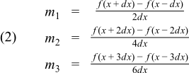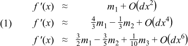 In this example we'll add even more power to generic numeric programming using not only different floating-point types but also function objects as template parameters. Consider some well-known central difference rules for numerically computing the first derivative of a function f′(x) with x ∈ ℜ: