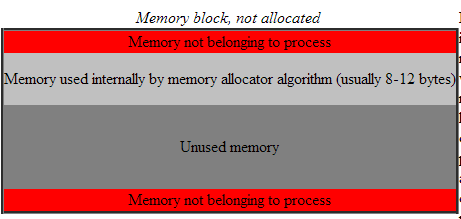 The heap is complicated. It has to satisfy any type of memory request, for any size, and do it fast. The common approaches to memory management have to do with splitting the memory up into portions, and keeping them ordered by size in some sort of a tree or list structure. Add in other factors, such as locality and estimating lifetime, and heaps quickly become very complicated. So complicated, in fact, that there is no known perfect answer to the problem of how to do dynamic memory allocation. The diagrams below illustrate how most common memory managers work: for each chunk of memory, it uses part of that memory to maintain its internal tree or list structure. Even when a chunk is malloc'ed out to a program, the memory manager must save some information in it - usually just its size. Then, when the block is free'd, the memory manager can easily tell how large it is.