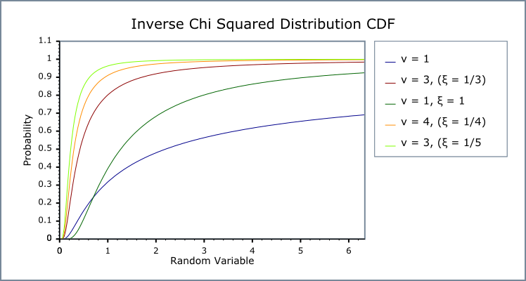 The following graphs illustrate how the PDF and CDF of the inverse chi_squared distribution varies for a few values of parameters ν and ξ: