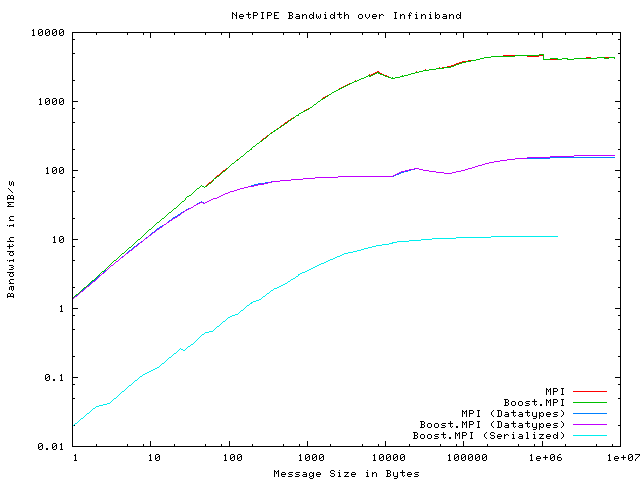 There are a some observations we can make about these NetPIPE results. First of all, the top two plots show that Boost.MPI performs on par with MPI for fundamental types. The next two plots show that Boost.MPI performs on par with MPI for derived data types, even though Boost.MPI provides a much more abstract, completely transparent approach to building derived data types than raw MPI. Overall performance for derived data types is significantly worse than for fundamental data types, but the bottleneck is in the underlying MPI implementation itself. Finally, when forcing Boost.MPI to serialize characters individually, performance suffers greatly. This particular instance is the worst possible case for Boost.MPI, because we are serializing millions of individual characters. Overall, the additional abstraction provided by Boost.MPI does not impair its performance.