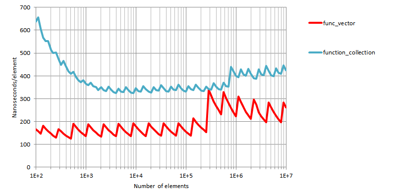 The figures show resulting times in nanoseconds/element. The horizontal axis is logarithmic.