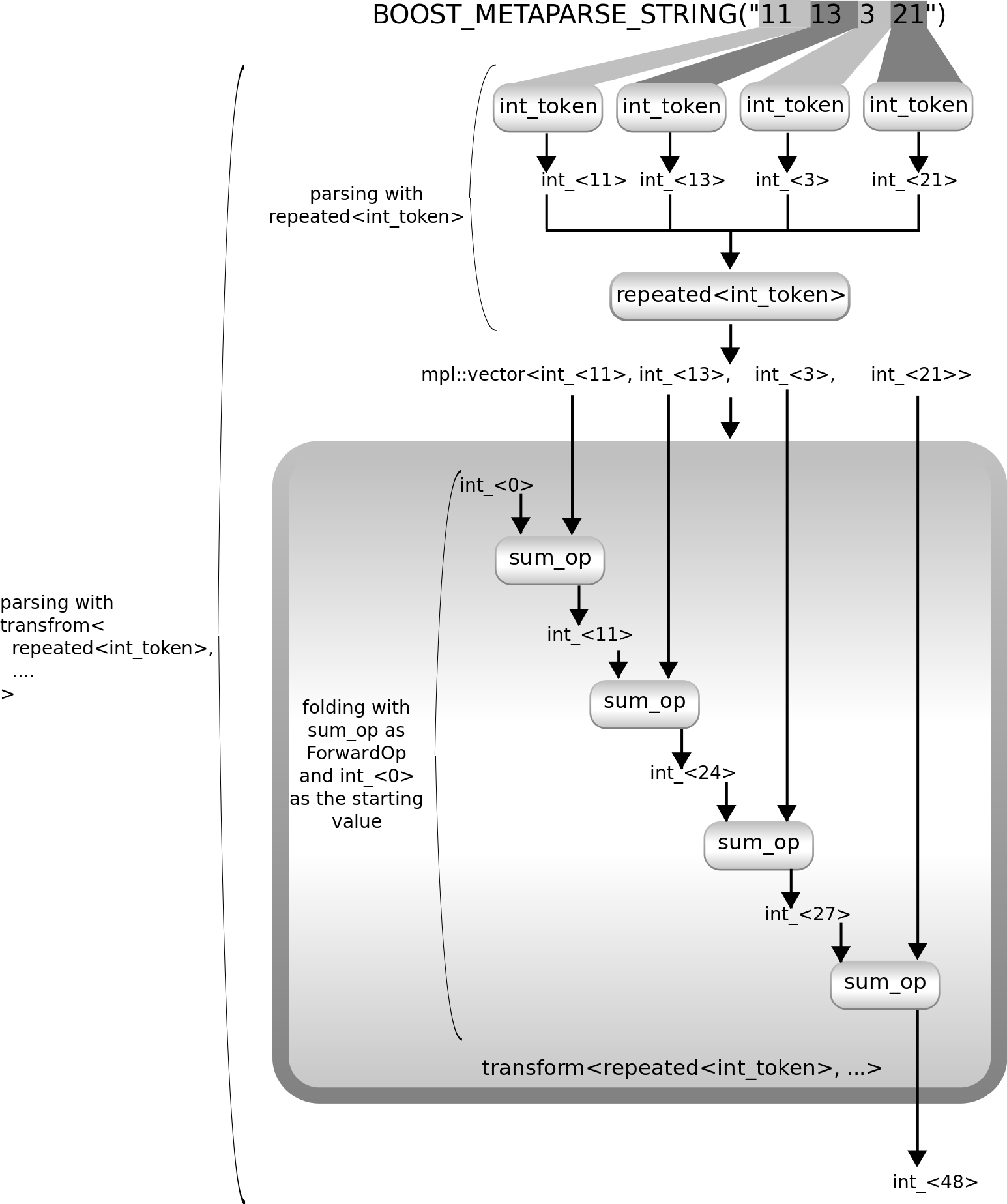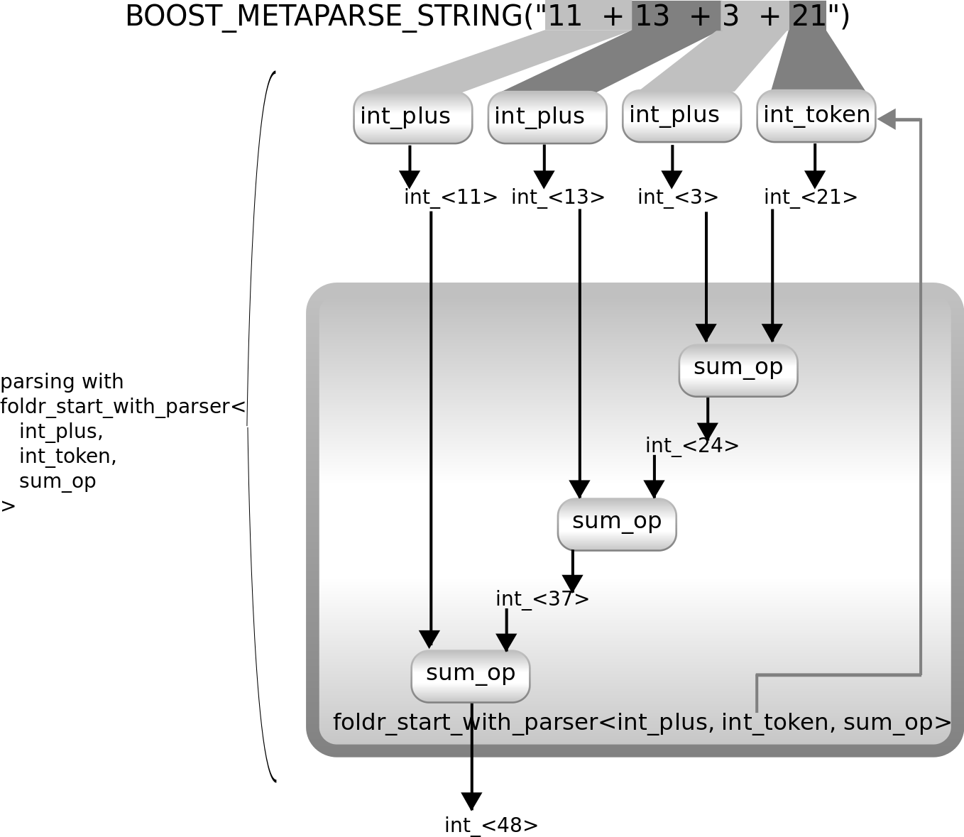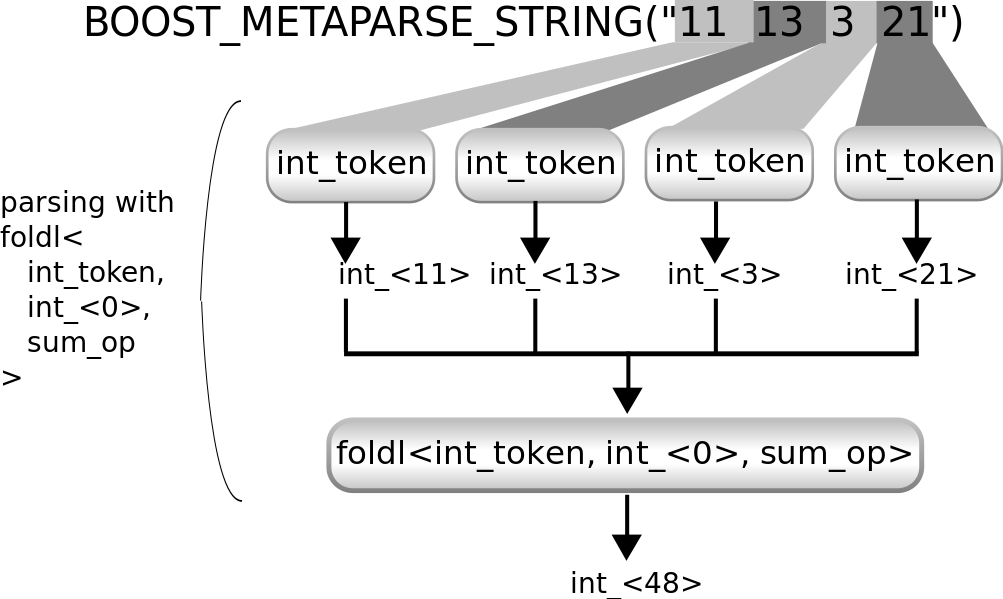 using sum_op = mpl::lambda<mpl::plus<mpl::_1, mpl::_2>>::type; using sum_parser = transform< repeated<int_token>, mpl::lambda< mpl::fold<mpl::_1, mpl::int_<0>, sum_op> >::type >;