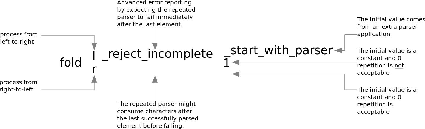 As you might have noticed, there are a lot of different folding parser combinators. To help you find the right one, the following naming convention is used: