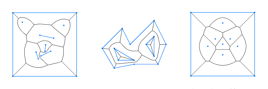 Fully Functional with SegmentsThere are just a few implementations of the Voronoi diagram construction algorithm that can handle input data sets that contain linear segments, even considering the commercial libraries. Support of the segments allows to discretize any input geometry (sampled floating-point coordinates can be scaled and snapped to the integer grid): circle, ellipse, parabola. This functionality allows to compute the medial axis transform of the arbitrary set of input geometries, with direct applications in the computer vision projects.Robustness and EfficiencyRobustness issues can be divided onto the two main categories: memory management issues and numeric stability issues. The implementation avoids the first type of the issues using pure STL data structures, thus there is no presence of the new operator in the code. The second category of the problems is resolved using the multiprecision geometric predicates. Even for the commercial libraries, usage of such predicates results in a vast performance slowdown. The library implementation overcomes this by avoiding the multiprecision computations in the 95% of the cases by using the efficient, floating-point based predicates. Such predicates don't produce the correct result always, however the library embeds the relative error arithmetic apparatus to identify such situations and switch to the higher precision predicates when appropriate. As the result, the implementation has a solid performance comparing to the other known libraries (more details in the benchmarks).Precision of the Output StructuresThe implementation guaranties, that the relative error of the coordinates of the output geometries is at most 64 machine epsilons (6 bits of mantissa, for the IEEE-754 floating-point type), while on average it's slightly lower. This means, that the precision of the output geometries can be increased simply by using a floating-point type with the larger mantissa. The practical point of this statements is explained in the following table: