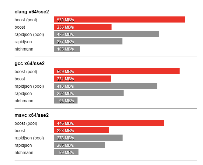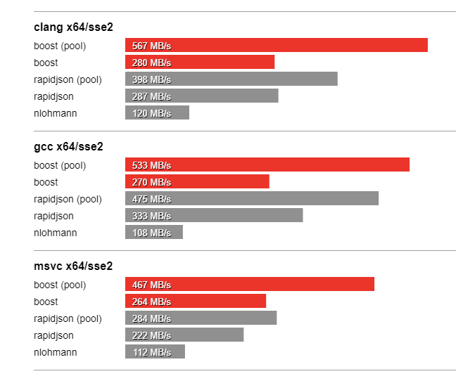 This section compares the performance of Boost.JSON with two widely used libraries with similar functionality: RapidJSON which is known for its performance, and JSON for Modern C++ which is known for feature-richness. The bench program measures the throughput of parsing and serialization for the a set of JSON representing typical workloads. These implementations are evaluated: