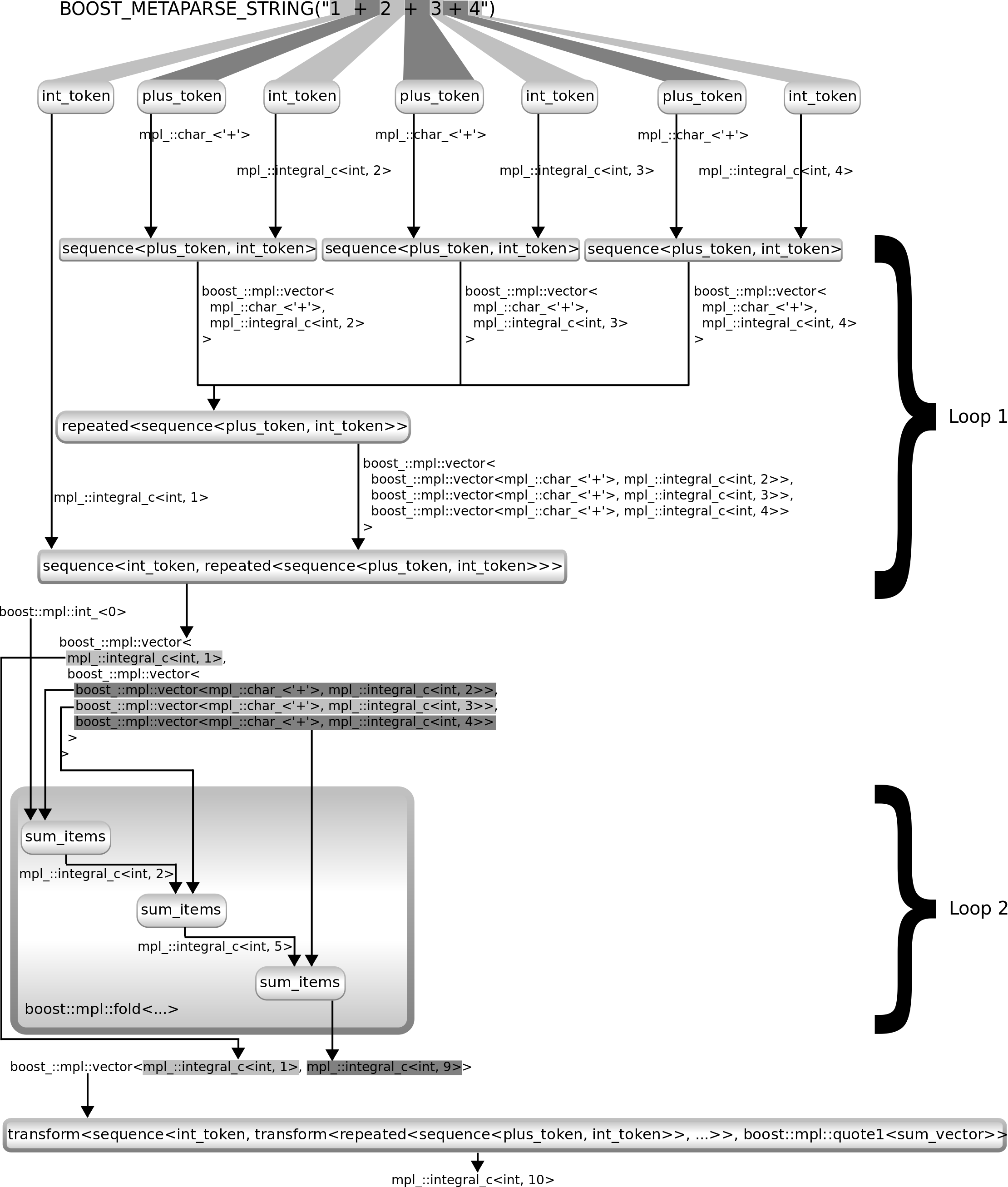 using exp_parser9 = build_parser< transform< /* What we had so far */ sequence< int_token, transform< repeated<sequence<plus_token, int_token>>, boost::mpl::lambda< boost::mpl::fold< boost::mpl::_1, boost::mpl::int_<0>, boost::mpl::quote2<sum_items> > >::type > >, boost::mpl::quote1<sum_vector> /* summarise the vector of numbers */ > >;