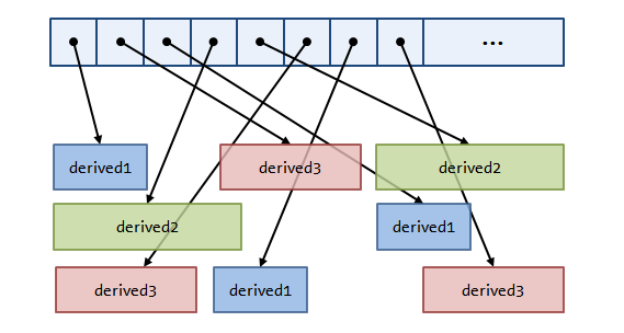 derived2 and derived3. The memory layout of a std::vector<base*> (or similar constructs such as std::vector<std::unique_ptr<base>>