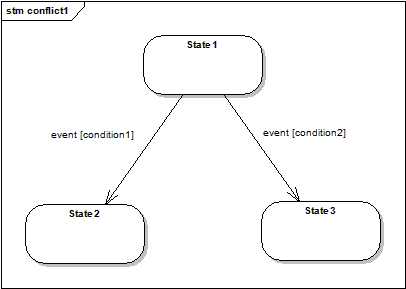 For a given source state, several transitions are defined, triggered by the same event. Normally, the guard condition in each transition defines which one is fired.