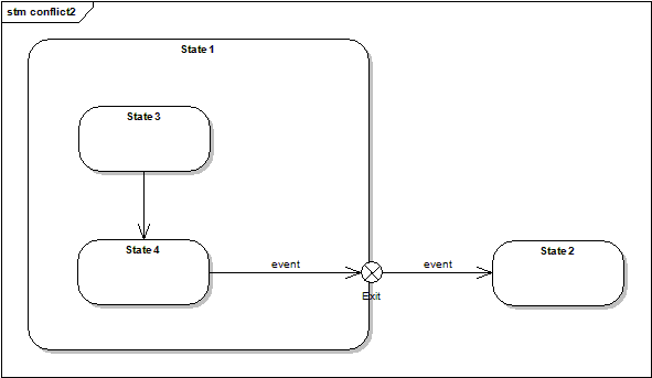 The source state is a submachine or simple state and the conflict is between a transition internal to this state and a transition triggered by the same event and having as target another state.