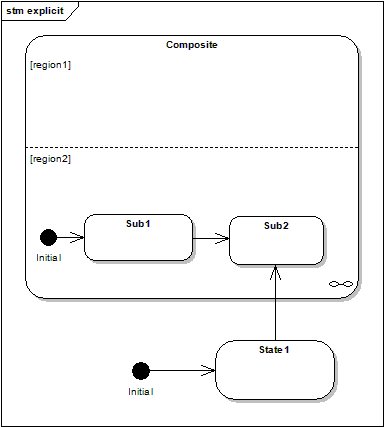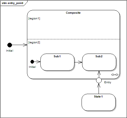 An entry point pseudo state allows a kind of controlled entry inside a composite. Precisely, it connects a transition outside the composite to a transition inside the composite. An important point is that this mechanism only allows a single region to be entered. In the above diagram, in region1, the initial state would become active.