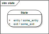 A simple state has no sub states. It can have data, entry and exit behaviors and deferred events. One can provide entry and exit behaviors (also called actions) to states (or state machines), which are executed whenever a state is entered or left, no matter how. A state can also have internal transitions which cause no entry or exit behavior to be called. A state can mark events as deferred. This means the event cannot be processed if this state is active, but it must be retained. Next time a state not deferring this event is active, the event will be processed, as if it had just been fired.