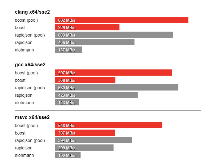 This section compares the performance of Boost.JSON with two widely used libraries with similar functionality: RapidJSON which is known for its performance, and JSON for Modern C++ which is known for feature-richness. The bench program measures the throughput of parsing and serialization for the a set of JSON representing typical workloads. These implementations are evaluated: