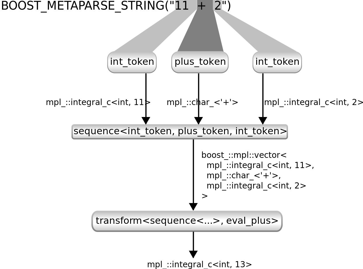 #include <boost/mpl/quote.hpp> using exp_parser6 = build_parser< transform< sequence<int_token, plus_token, int_token>, boost::mpl::quote1<eval_plus> > >;