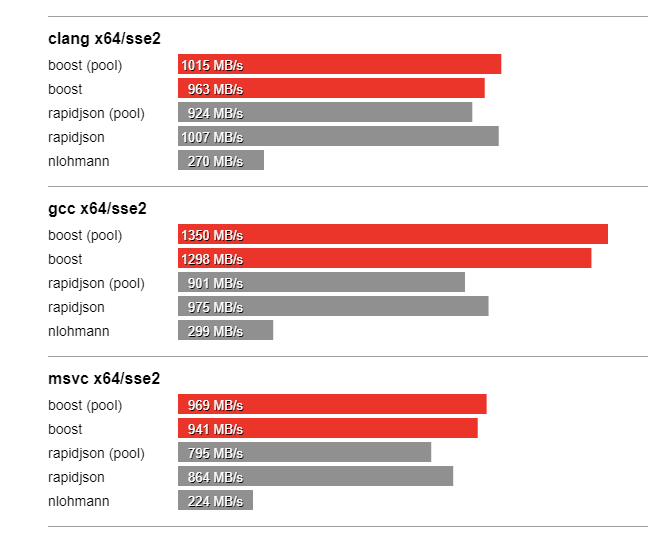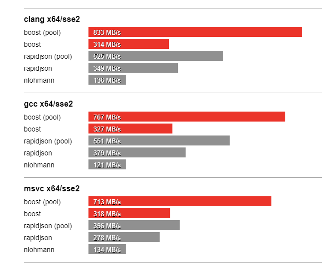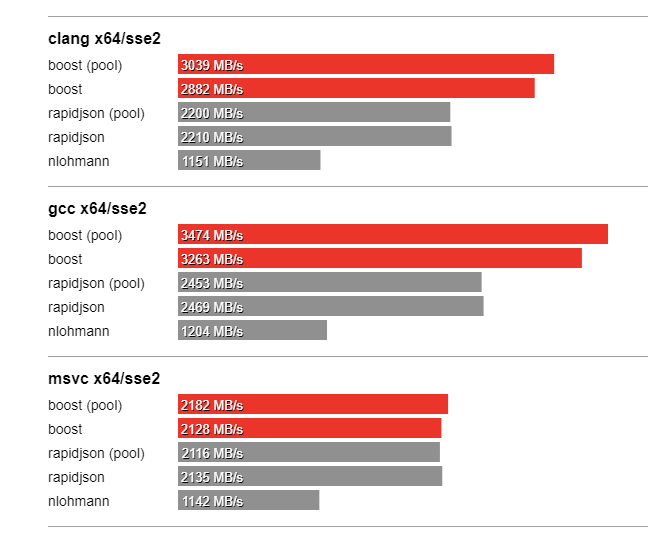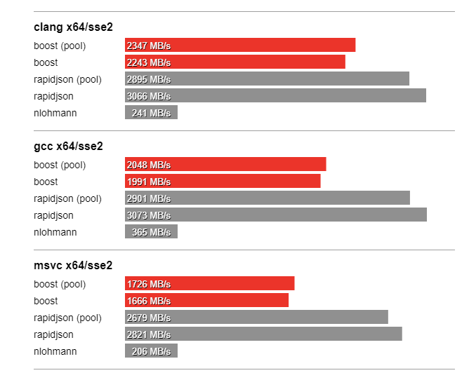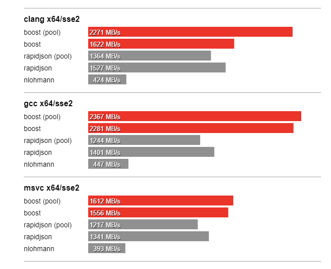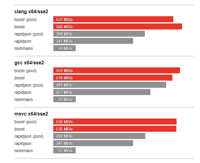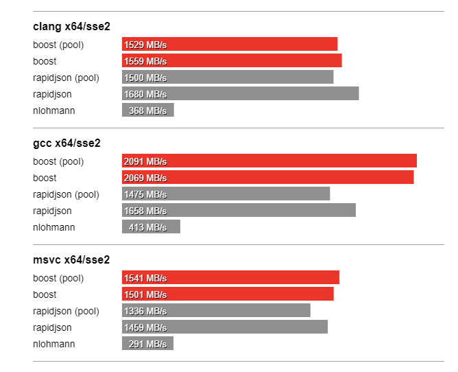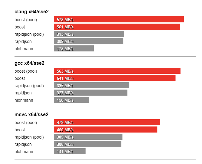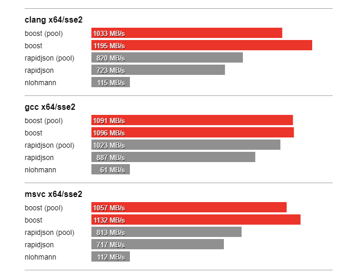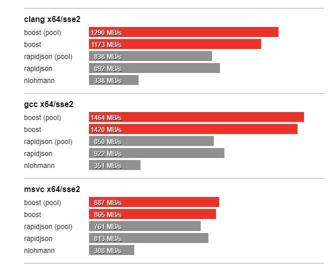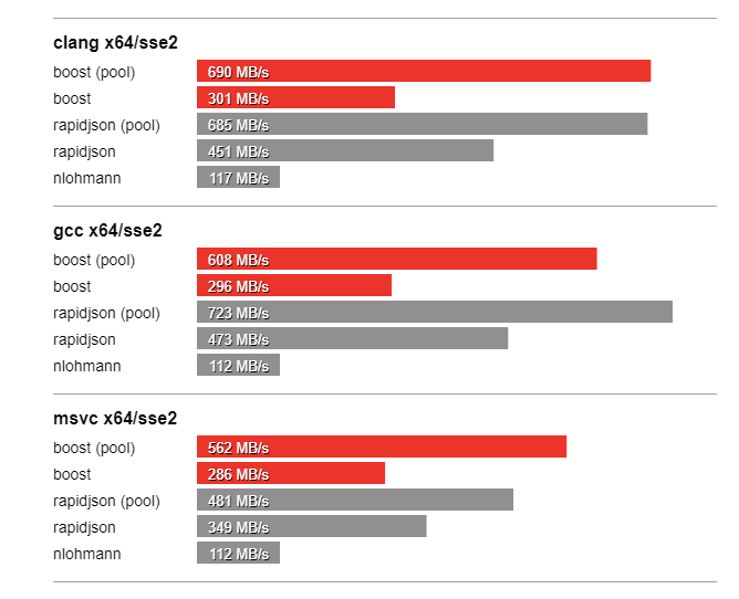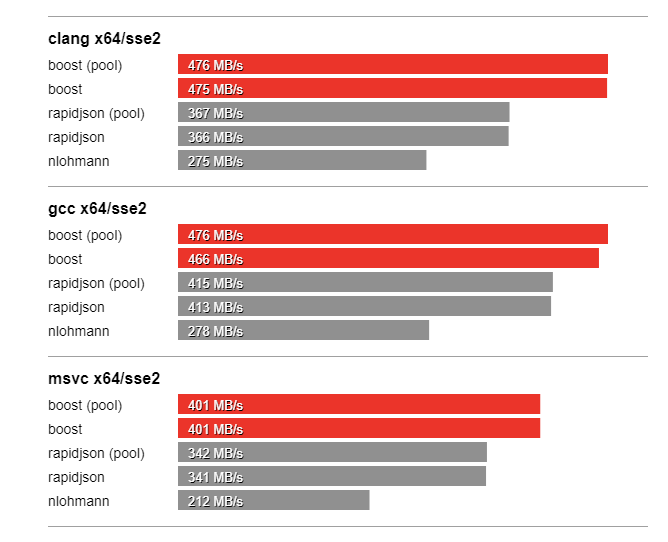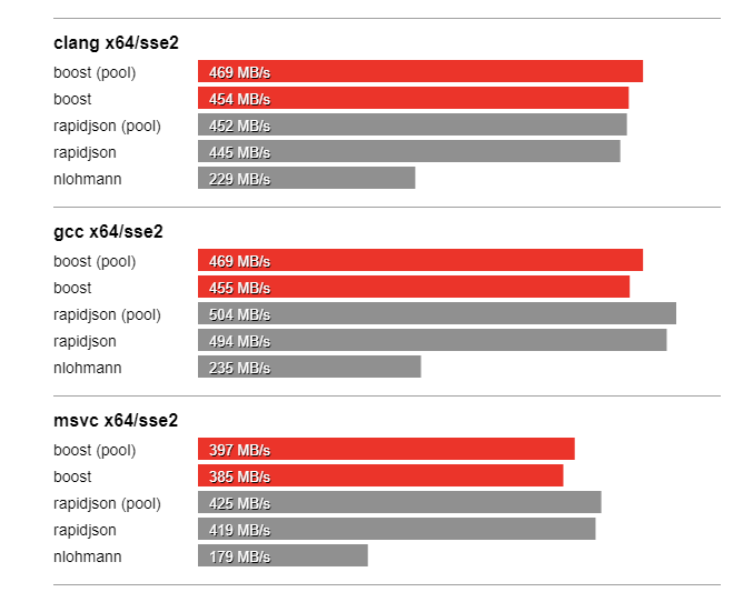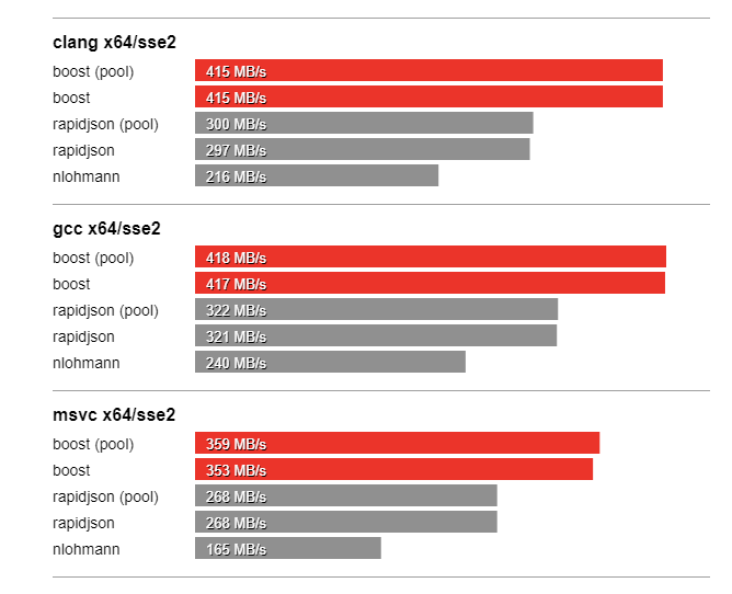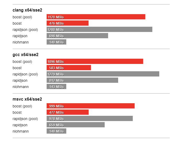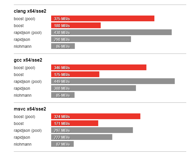 This section compares the performance of Boost.JSON with two widely used libraries with similar functionality: RapidJSON which is known for its performance, and JSON for Modern C++ which is known for feature-richness. The bench program measures the throughput of parsing and serialization for the a set of JSON representing typical workloads. These implementations are evaluated: