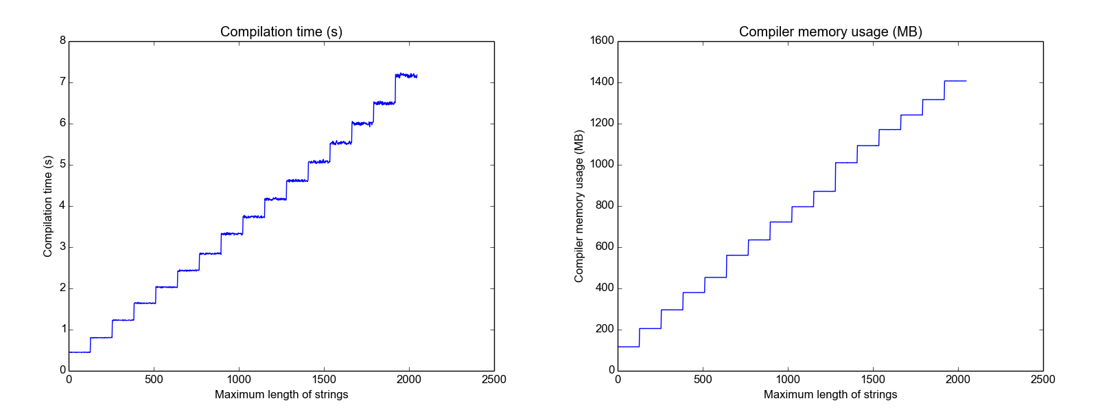 100 one character long strings with increasing maximum length. Measured on a Linux-3.13.0-24-generic-x86_64-with-Ubuntu-14.04-trusty host with 16 GB memory. Compiler used: gcc 4.8.5.