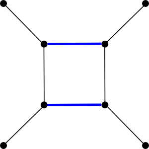 A matching is a subset of the edges of a graph such that no two edges share a common vertex. Two different matchings in the same graph are illustrated below (edges in the matching are colored blue.) The matching on the left is a maximal matching, meaning that its size can't be increased by adding edges. The matching on the right is a maximum cardinality matching, meaning that is has maximum size over all matchings in the graph.