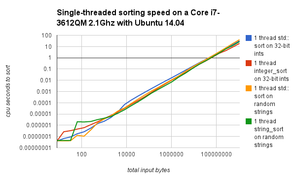Direct performance comparisons on a newer x86 system running Ubuntu, with the fallback to std::sort at lower input sizes disabled are below.