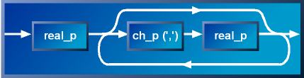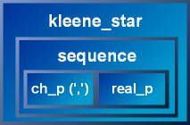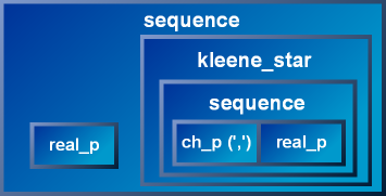 Top-down descent traverses the hierarchy. The outer sequence calls the leftmost real_p parser. If successful, the kleene_star is called next. The kleene_star calls the inner sequence repeatedly in a loop until it fails to match, or the input is exhausted. Inside, ch_p(',') and then real_p are called in sequence. The following diagram illustrates what is happening, somewhat reminiscent of Pascal syntax diagrams.